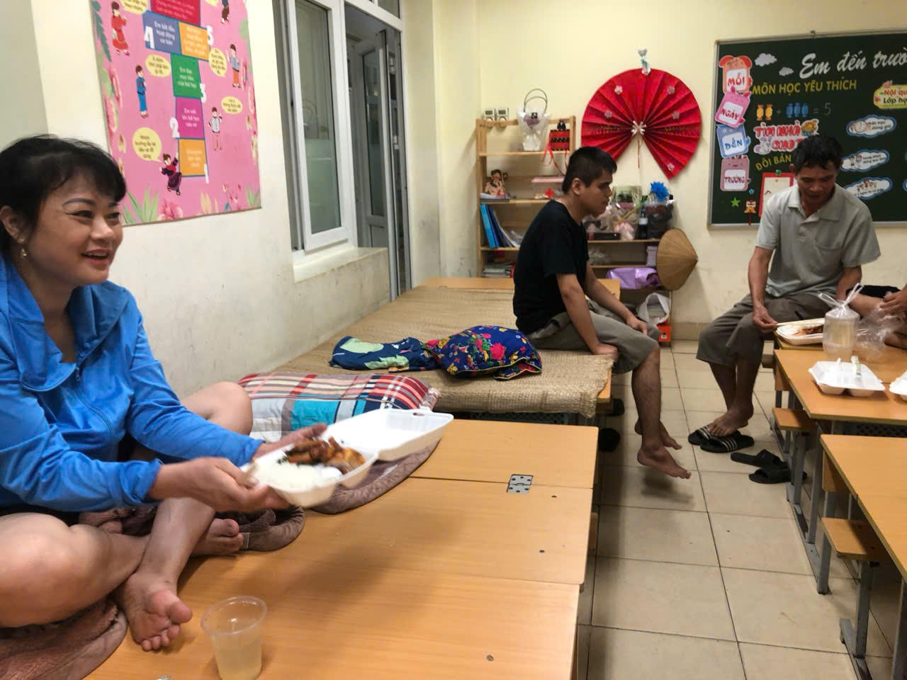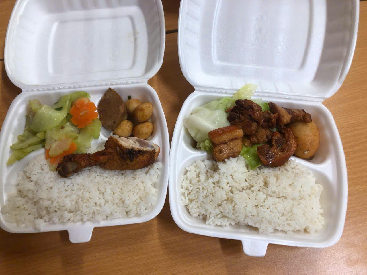 Công an phường Lý Thái Tổ, quận Hoàn Kiếm cấp phát suất ăn cho người dân lưu trú tại trường học. |