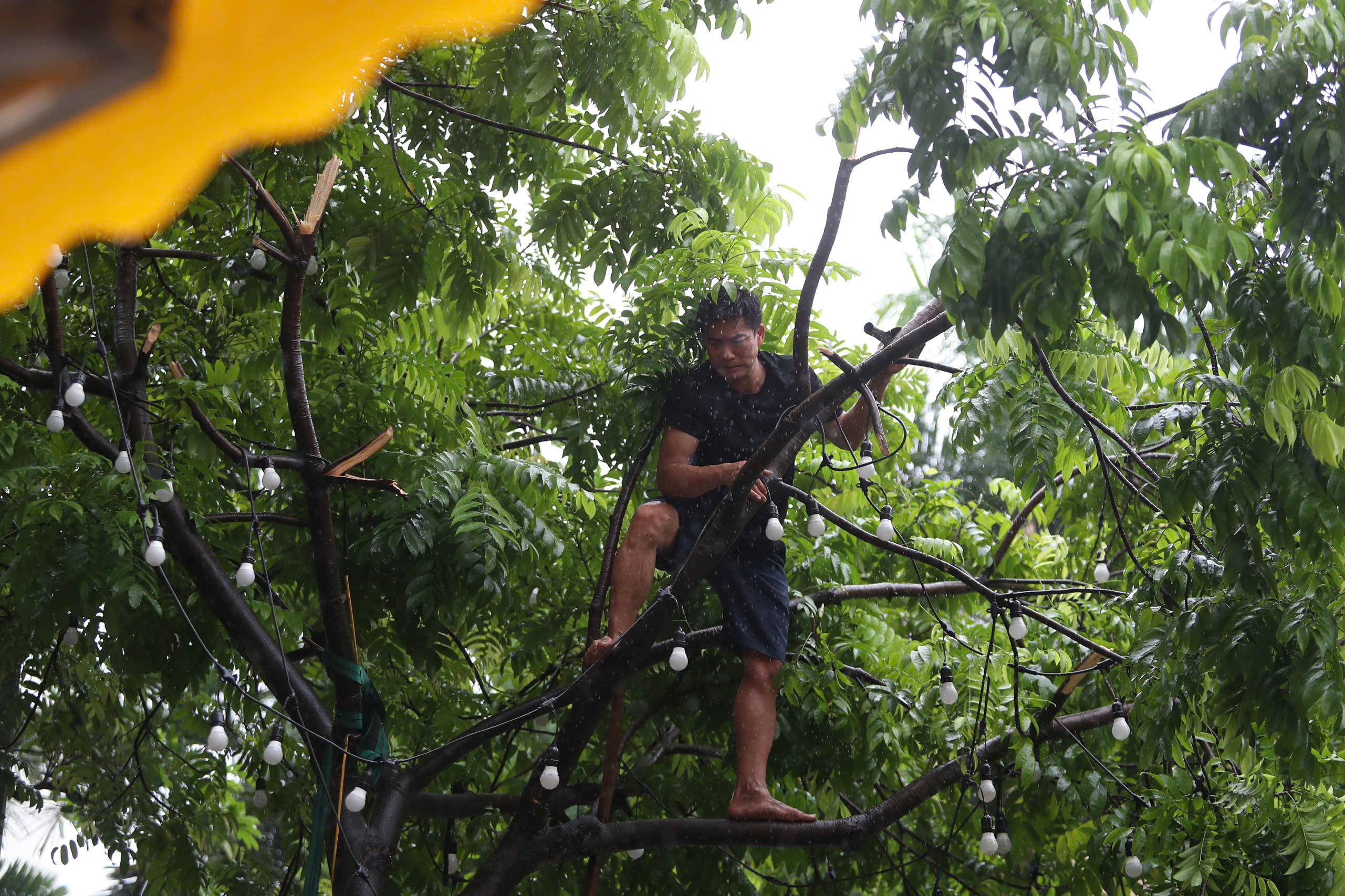 Người dân Hà Nội chủ động phát cành cây, để hạn chế thiệt hại khi gió bão mạnh hơn. |