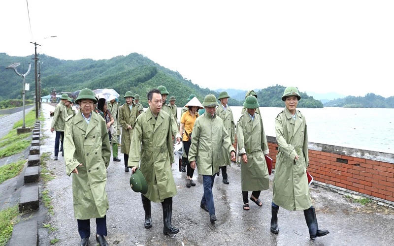 Bộ trưởng Lê Minh Hoan cùng đoàn công tác thị sát tình hình bão tại tại hồ Yên Lập, Quảng Ninh. |