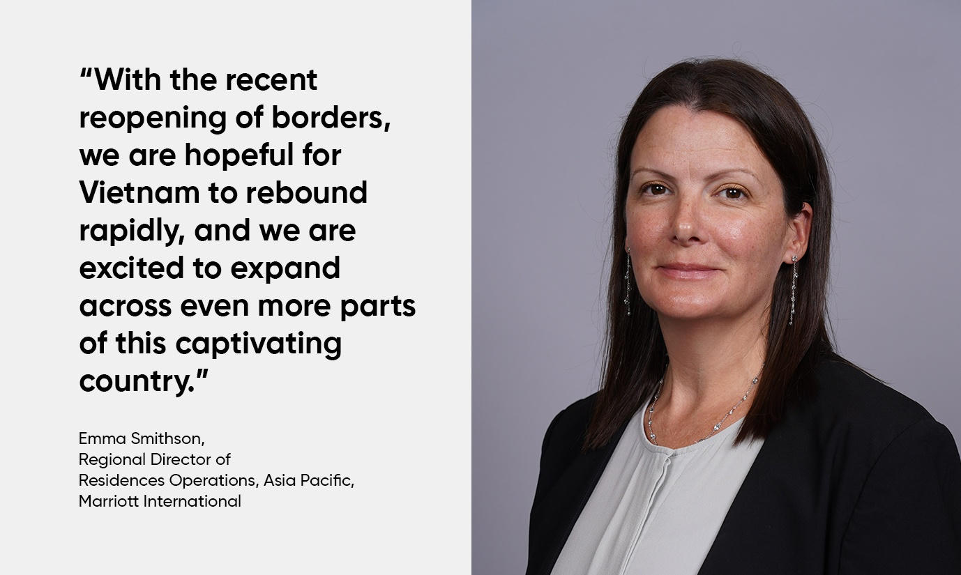 Trả lời Bloomberg về tiềm năng của Việt Nam, đại diện Marriott chia sẻ: “Với việc mở cửa du lịch trở lại, chúng tôi hy vọng Việt Nam sẽ phục hồi nhanh chóng và rất mong có thể tiếp tục mở rộng danh mục của mình đến nhiều địa điểm tại đất nước đầy sức hút này”, Emma Smithson, giám đốc khu vực châu Á - Thái Bình Dương của Marriott International chia sẻ.