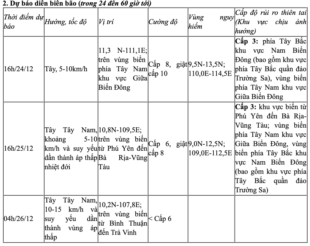 Về thời tiết trên đất liền, Cơ quan khí tượng dự báo, từ đêm 23/12 đến ngày 25/12, ở khu vực từ Đà Nẵng đến Khánh Hoà có mưa vừa, mưa to, cục bộ có nơi mưa rất to và dông với lượng mưa phổ biến từ 60-150mm, cục bộ có nơi trên 250mm. Cảnh báo nguy cơ có mưa cục bộ cường suất lớn (>100mm/6h).