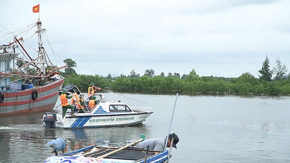 Lực lượng Đồn Biên phòng Nhật Lệ (Quảng Bình) kêu gọi và sắp xếp tàu thuyền về âu thuyền Bảo Ninh neo đậu tránh bão. Ảnh: Hoài Nam. |