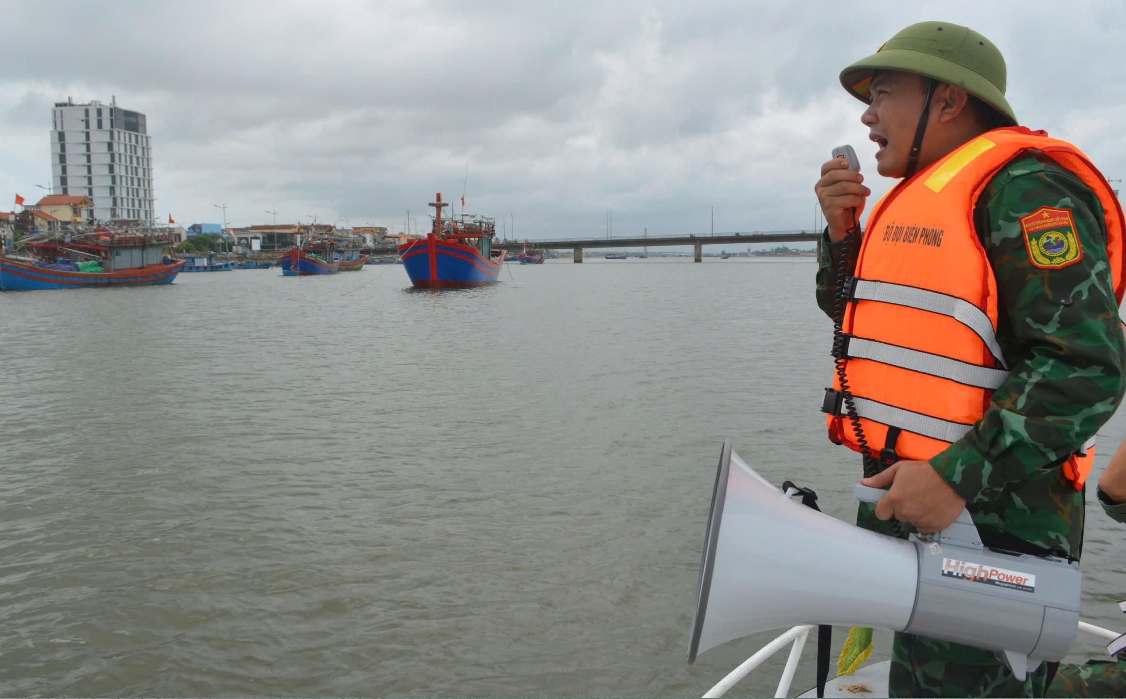 Cán bộ, chiến sĩ Đồn Biên phòng cửa khẩu cảng Thuận An kêu gọi tàu thuyền vào bờ trú ẩn an toàn. |