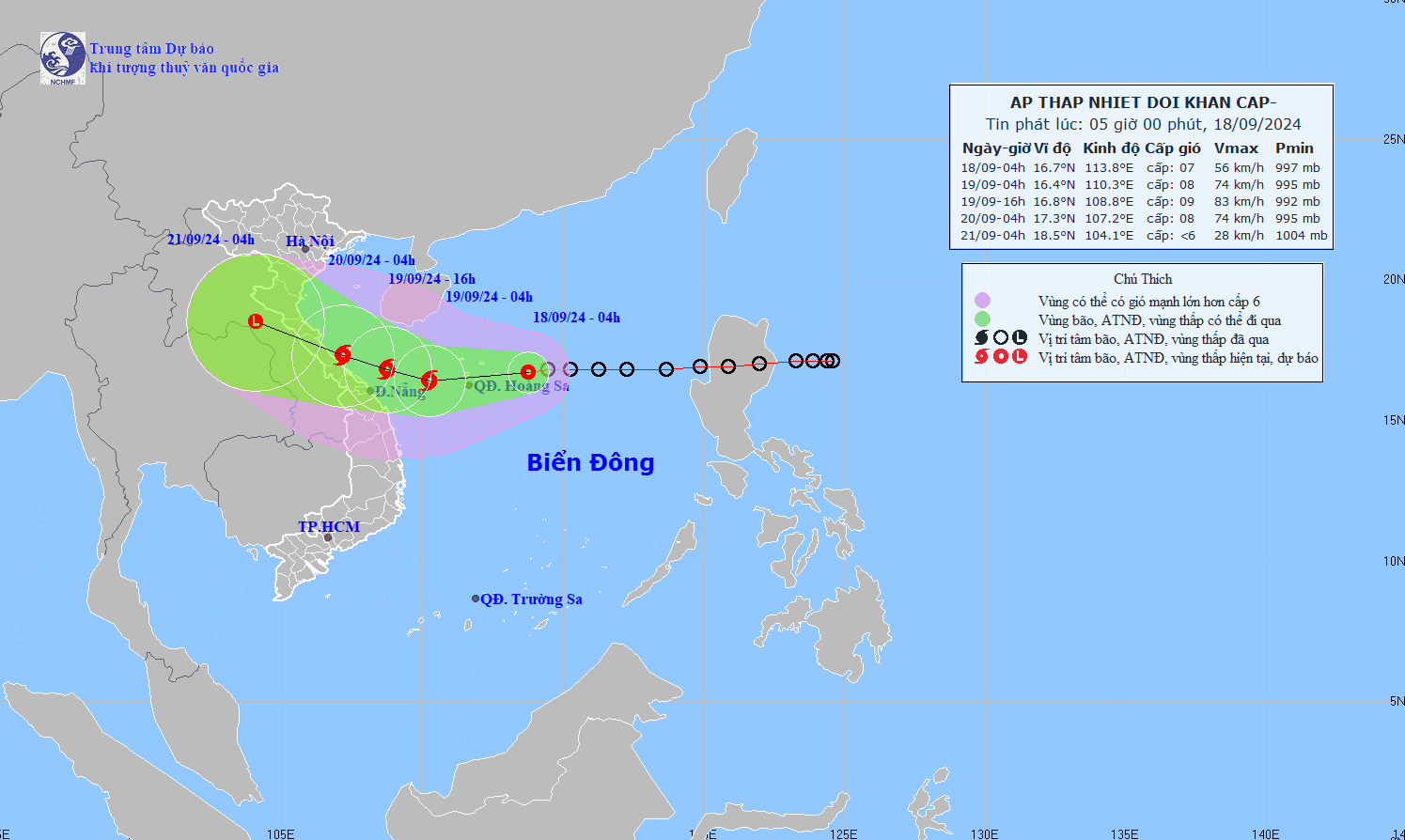 Theo Trung tâm dự báo khí tượng thủy văn quốc gia, hồi 4 giờ ngày 18/9, vị trí tâm ATNĐ ở vào khoảng 16,7 độ Vĩ Bắc; 113,8 độ Kinh Đông, cách quần đảo Hoàng Sa khoảng 250 km về phía Đông.