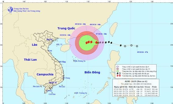 Cùng đó trong 24 - 48h tới bão số 6 áp sát quần đảo Hoàng Sa, đến 04 giờ ngày 09/10, vị trí tâm bão ở vào khoảng 20,7 độ Vĩ Bắc; 115,2 độ Kinh Đông, cách quần đảo Hoàng Sa khoảng 530km về phía Đông Bắc. Sức gió mạnh nhất ở vùng gần tâm bão mạnh cấp 10-11 (90-120km/giờ), giật cấp 12-13.