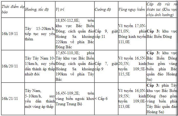 Cơ quan khí tượng cho biết, 16h ngày 18/11, vị trí tâm bão số 9 trên khu vực Bắc Biển Đông, cách quần đảo Hoàng Sa khoảng 510km về phía Đông Đông Bắc. Sức gió mạnh nhất vùng gần tâm bão mạnh cấp 11 (103-117km/h), giật cấp 14. Bão di chuyển theo hướng Tây Tây Bắc, tốc độ khoảng 20km/h.