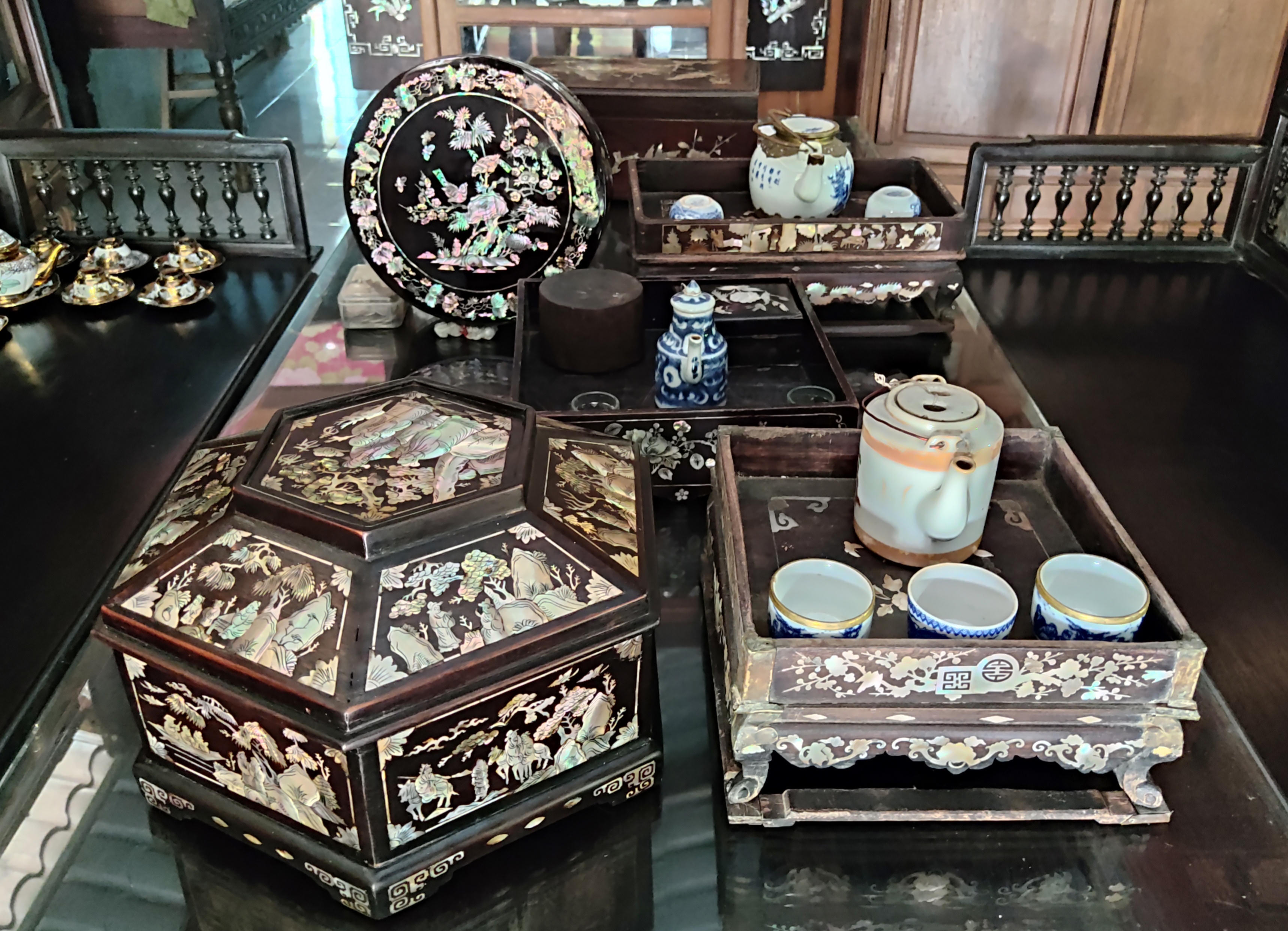 Bộ khay, tráp, quả được khảm hoa,lá rất tinh xảo là tài sản vô giá đối với ông Chẳng. |