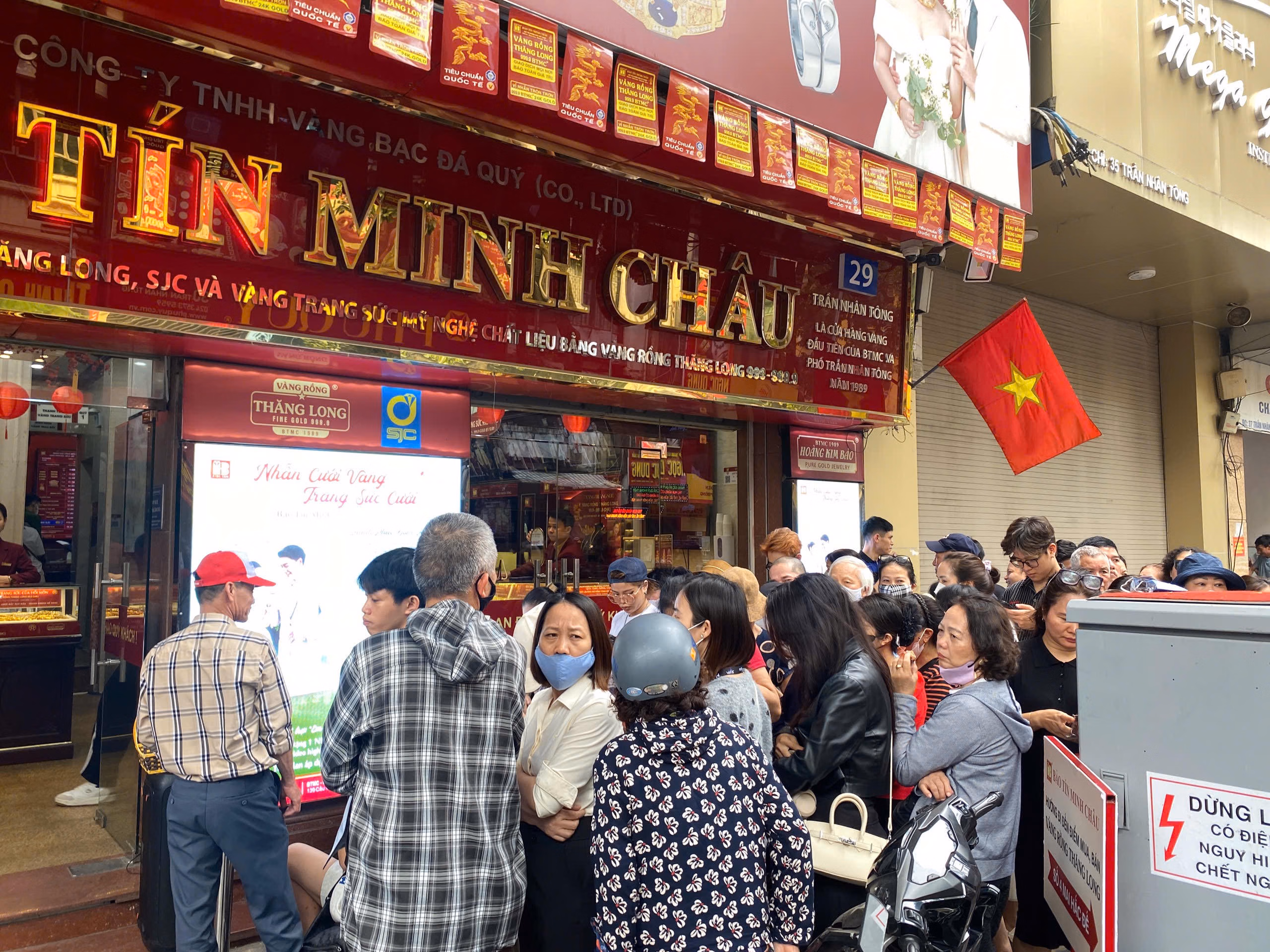 Ghi nhận tại cửa hàng Bảo Tín Minh Châu trên phố Trần Nhân Tông có khá nhiều người dân đến xếp hàng để chờ mua vàng, giao dịch diễn ra ổn định và khá sôi động. Phần lớn trong số những người chờ giao dịch là người dân đã đặt mua vàng trước đó và đến nhận theo lịch hẹn. Một số khách khác thì đến giao dịch mới.