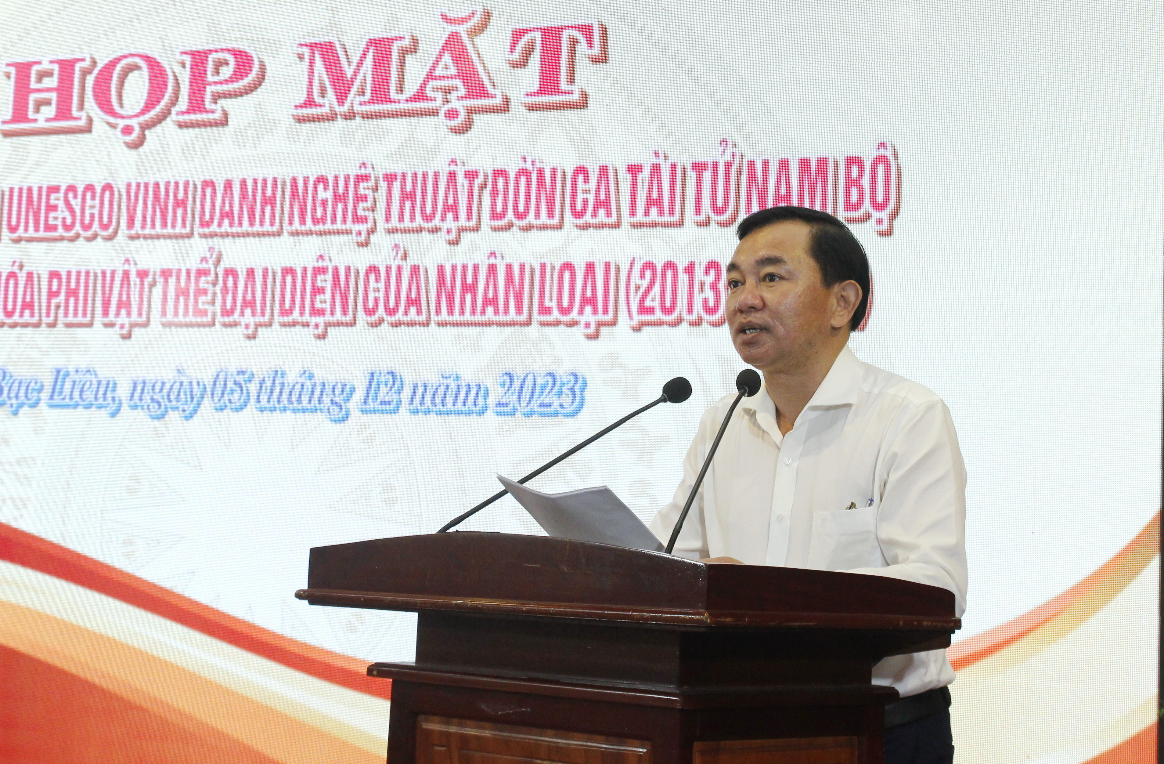 Bạc Liêu vinh dự là một trong 21 tỉnh, thành lưu giữ và phát triển Nghệ thuật Đờn ca tài tử Nam Bộ. Bạc Liêu đã, đang và sẽ triển khai có hiệu quả Chương trình hành động quốc gia bảo vệ và phát huy giá trị của Nghệ thuật Đờn ca tài tử Nam Bộ. Để đánh giá công tác bảo tồn và phát huy giá trị Di sản văn hoá phi vật thể Nghệ thuật Đờn ca tài tử Nam Bộ sau 10 năm triển khai thực hiện. Đồng thời, tôn vinh và tri ân sự đóng góp to lớn của các Nghệ nhân ưu tú trong quá trình gìn giữ, lưu truyền và lan tỏa giá trị độc đáo của loại hình nghệ thuật này, đến nay trên địa bàn tỉnh Bạc Liêu có trên 150 câu lạc bộ đờn ca tài tử, với gần 2.000 thành viên…”.