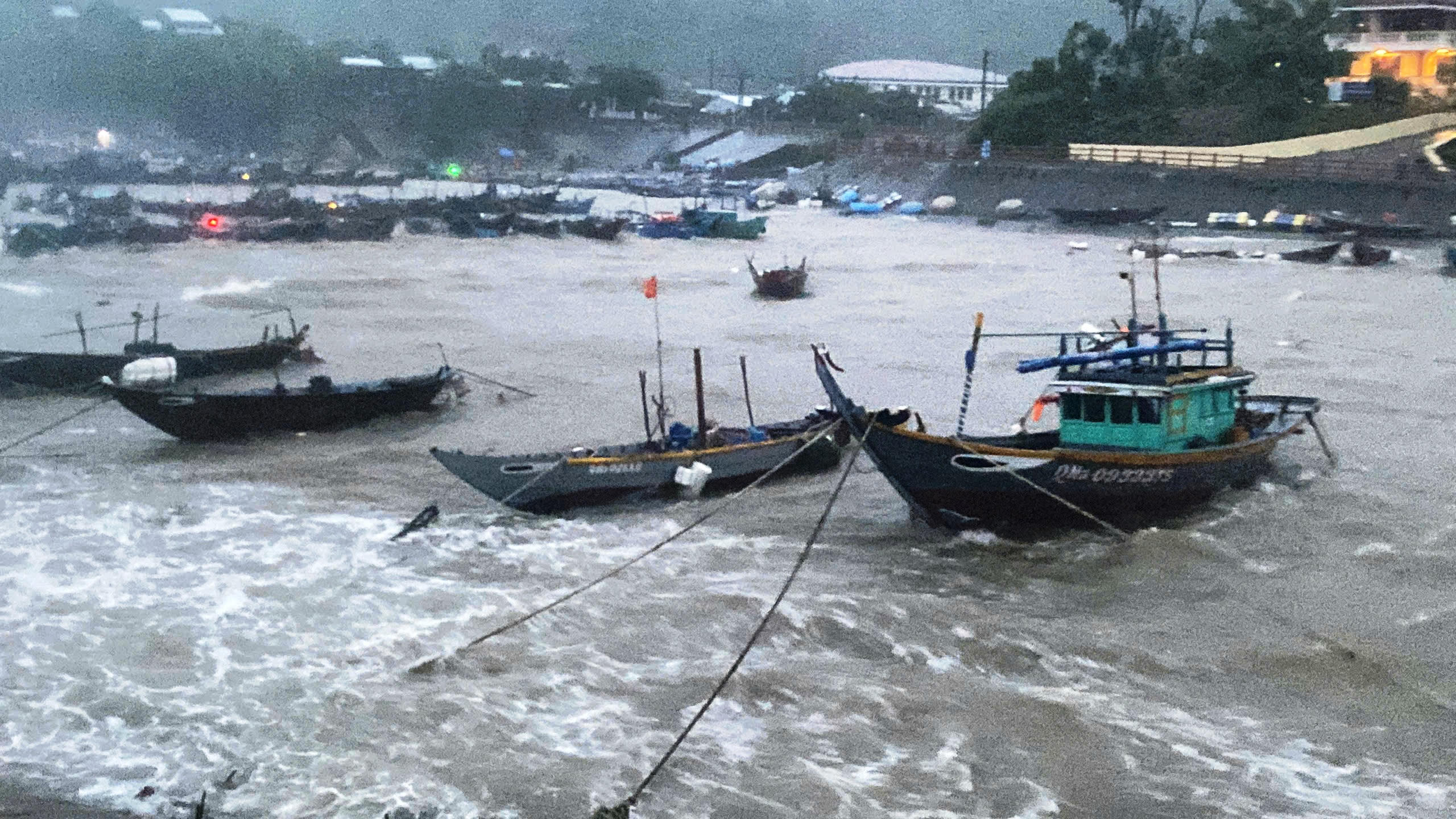 Nhiều tàu thuyền đậu tại âu thuyền trên đảo Cù Lao Chàm bị sóng đánh. (Ảnh: C. Huy) |