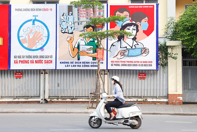 Nội dung phòng, chống dịch COVID -19 được truyền tải bằng tranh cổ động đến mọi người với những thông điệp dễ nhớ. Ảnh Quang Thái - Báo HNM |