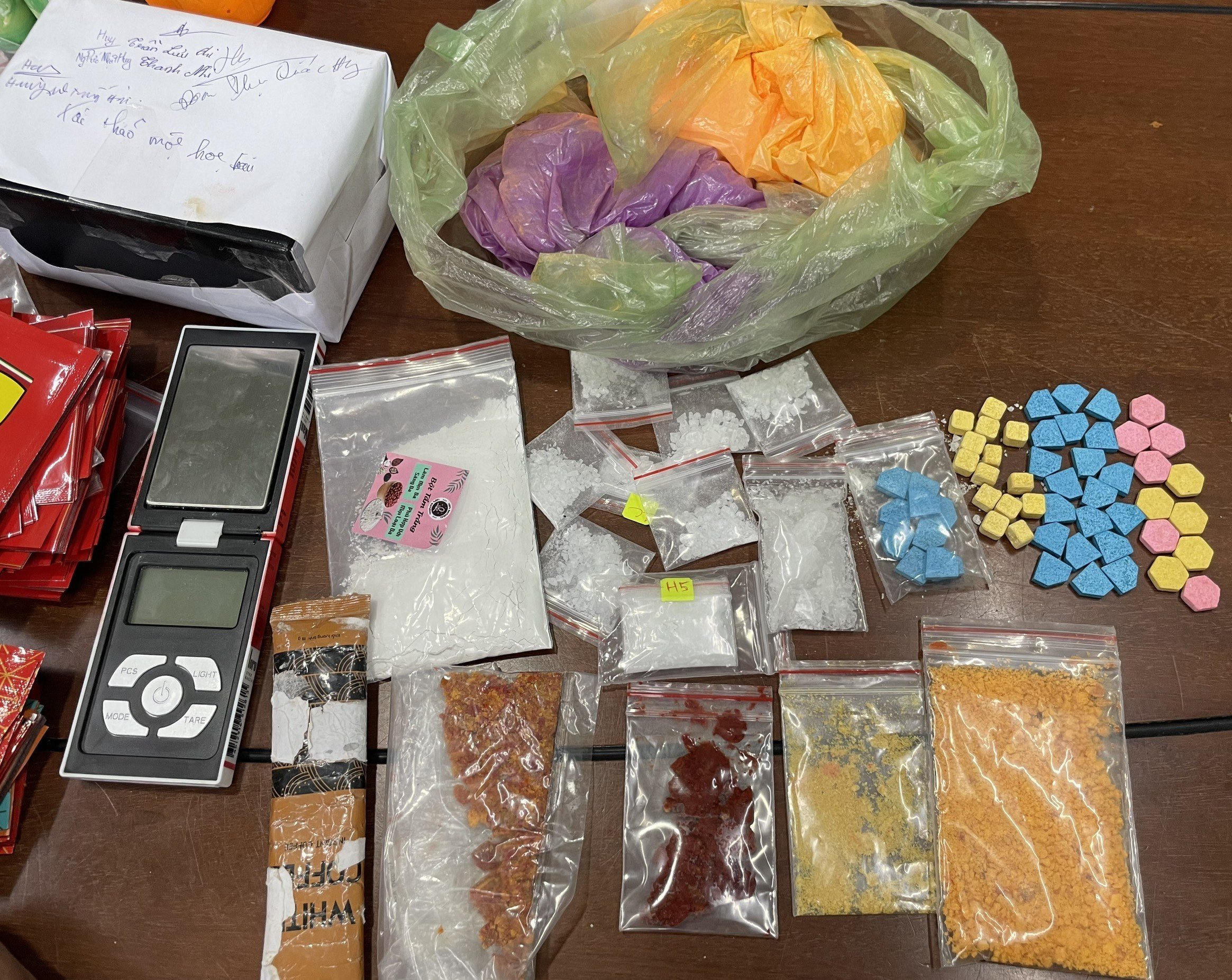 Tại đây, cảnh sát bắt quả tang Đoàn Phạm Quốc Huy (22 tuổi, trú phường Mỹ An) cùng Huỳnh Tuấn Hải (20 tuổi, trú phường Điện Ngọc, thị xã Điện Bàn, tỉnh Quảng Nam) đang tàng trữ 44 viên thuốc lắc, 8 gói ketamin, 1 gói ma túy đá, 1 hộp cần sa, 5 kg bột màu, 1.000 vỏ bao nilong bên ngoài có các nhãn hiệu Chali, Kush cùng các dụng cụ điều chế ma túy.