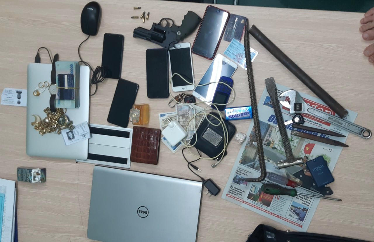 Tại nơi ở của các đối tượng, Công an thu giữ hơn 10 triệu đồng, 3 chỉ vàng, 7 điện thoại di động, 2 máy tính xách tay, 1 khẩu súng bắn đạn chì và nhiều công cụ, vật dụng dùng để phá khóa đột nhập nhà dân.