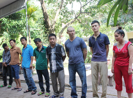 Danh tính các đối tượng bị bắt giữ gồm: Bạch Quốc Hùng (SN 1974 – chủ nhà); Nguyễn Văn Hưng (SN 1975, trú tại xã Hưng Thịnh, Hưng Nguyên, Nghệ An); Phạm Minh Chiến (SN 1986, trú tại Nghi Trung, Nghi Lộc); Trịnh Minh Thắng (SN 1979, trú tại phường Quang Trung, TP.Vinh); Phạm Quang Hùng (SN 1982, trú tại xã Nghi Phú, TP.Vinh); Nguyễn Quang Vinh (SN 1976, trú tại xã Nghi Phú); Phạm Thị Hồng (SN 1967, trú tại phường Hưng Bình, TP.Vinh); Lê Trung Kiên (SN 1984, trú tại phường Lê Mao. TP.Vinh) và Phạm Ngọc Hoài (SN 1985, trú tại phường Quán Bàu, TP.Vinh).