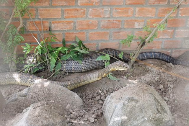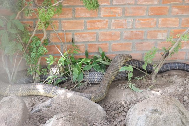 Ông Trương Vĩnh Thành - Phó Tổng giám đốc Tập đoàn Sao Mai (đơn vị thi công công trình điện năng lượng mặt trời) cho biết, cặp rắn hổ mây “khủng” được nhóm công nhân Ấn Độ bắt được khoảng 2 tuần nay, đang nuôi dưỡng và chăm sóc đặc biệt tại Khu di tích lịch sử đồi Tức Dụp để cho khách tham quan, nhìn ngắm.