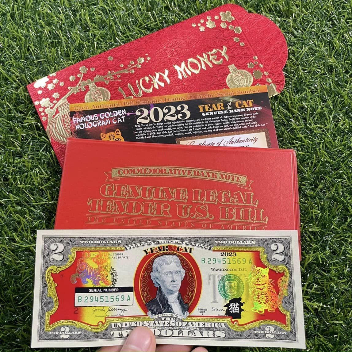 Tờ 2 USD in hình mèo - biểu tượng năm Quý Mão 2023 được rao bán với giá lên tới 55.000 đồng trong khi giá USD hiện chưa tới 24.000 đồng. |