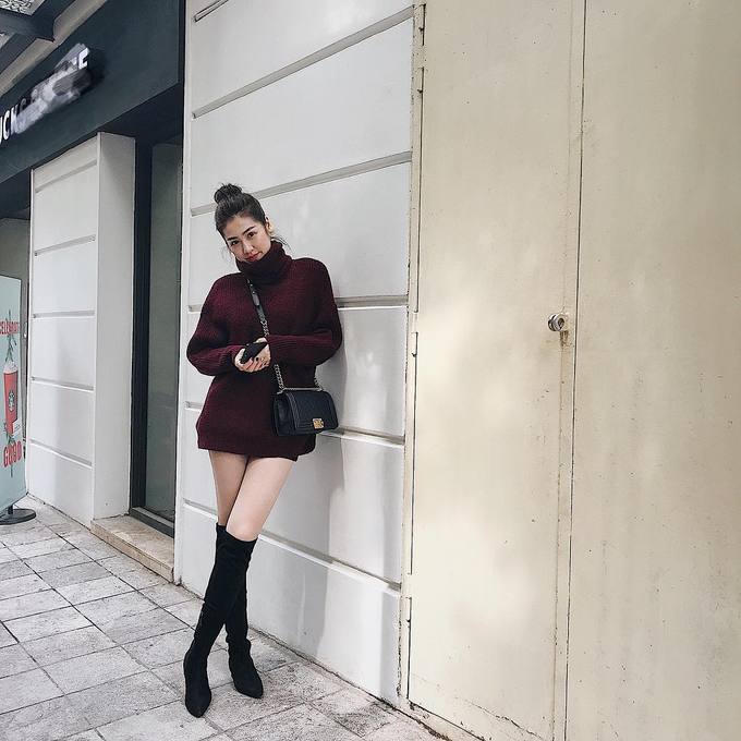 Cô nàng Phí Phương Anh kết hợp dáng boots này cùng chân váy xòe và áo len oversized đem lại diện mạo năng động, nhí nhảnh. Nếu là tín đồ của phong cách này bạn đừng quên sử dụng thêm quần tất màu nude để giữ ấm cho cơ thể.