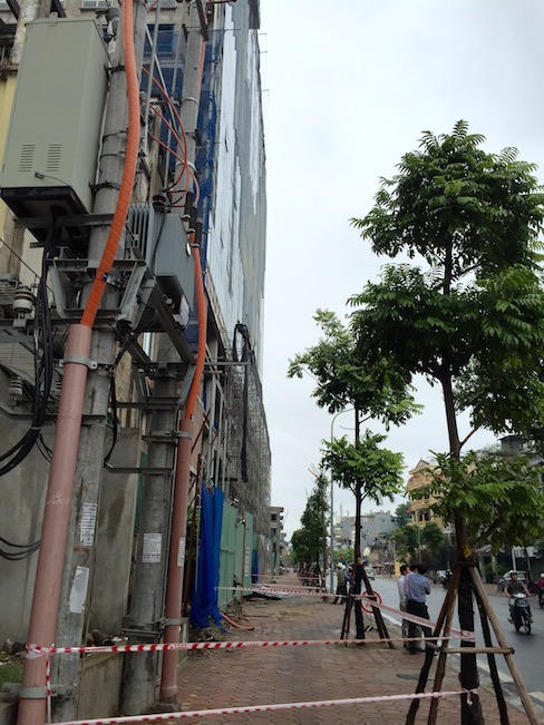 Lúc 8:30 phút sáng nay, tại toà nhà 8B Lê Trực, đơn vị phá dỡ bắt đầu thực hiện việc dựng hệ thống giàn giáo, bao che an toàn công trình.