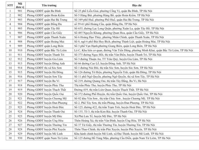 | Danh sách Danh sách 30 địa điểm tiếp nhận phiếu đăng ký dự thi tốt nghiệp THPT của thí sinh tự do |