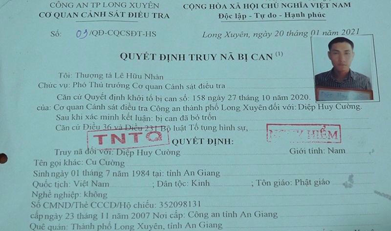 Đến ngày 20/01/2021, Cơ quan Cảnh sát điều tra Công an thành phố Long Xuyên ra Quyết định truy nã nguy hiểm toàn quốc đối với Diệp Huy Cường. Sau thời gian lẩn trốn ở nhiều nơi, khi Cường vừa đến khu vực ấp Hòa Tân, xã Hòa Bình Thạnh, huyện Châu Thành, An Giang thì bị lực lượng Công an xã bắt giữ.