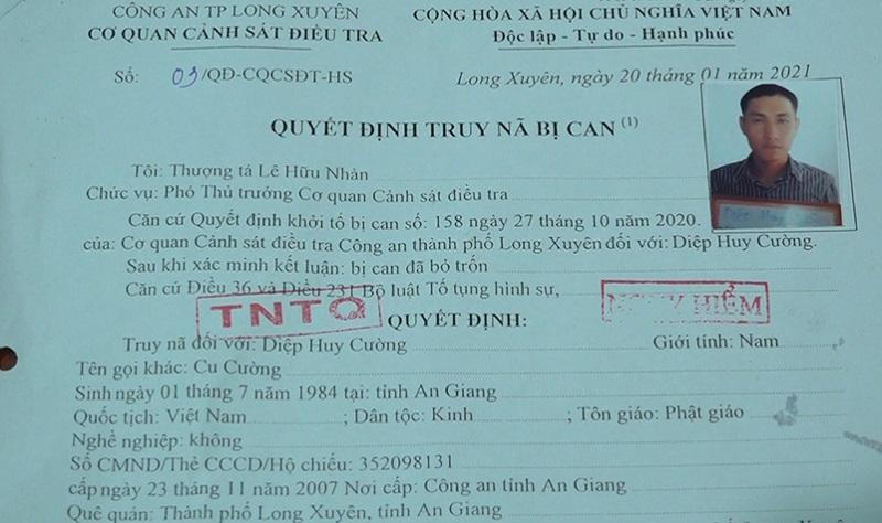 Quyết định truy nã Diệp Huy Cường. |