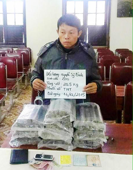 Tại hiện trường tịch thu tang vật gồm 20,5 kg thuốc nổ TNT. Tại Đồn BP Quỳnh Phương đối tượng Nguyễn Sỹ Bình (SN 1970, trú tại xã Quỳnh Vinh, TX Hoàng Mai) đã khai nhận số thuốc nổ trên được mua lại của một đối tượng (không rõ tên tuổi) về tiêu thụ thì bị bắt./.