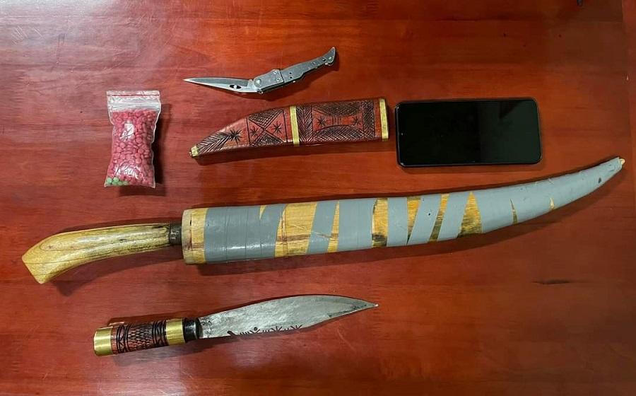 Tại thời điểm kiểm tra, lực lượng chức năng phát hiện trên xe có một số vũ khí thô sơ và một gói ni long bên trong chứa 602 viên nén màu hồng và 06 viên nén màu xanh nghi là ma túy.