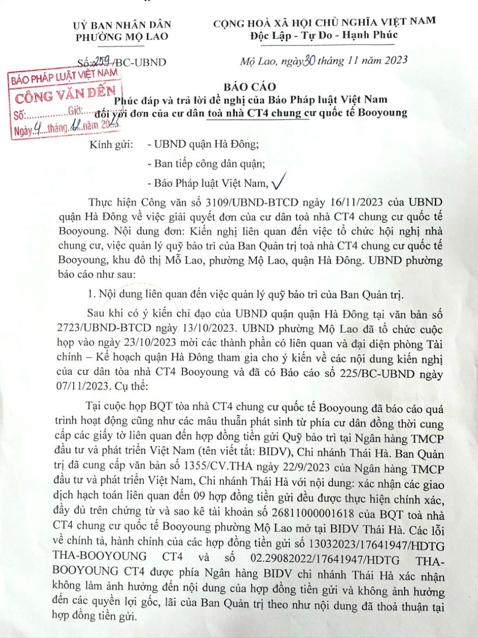 (PLVN) - Báo PLVN vừa nhận được Công văn 259/BC-UBND của UBND phường Mộ Lao, quận Hà Đông (Hà Nội) trả lời đơn một số hộ dân ngụ tòa CT4, chung cư Booyoung, khu đô thị Mỗ Lao, do Báo PLVN chuyển đến.