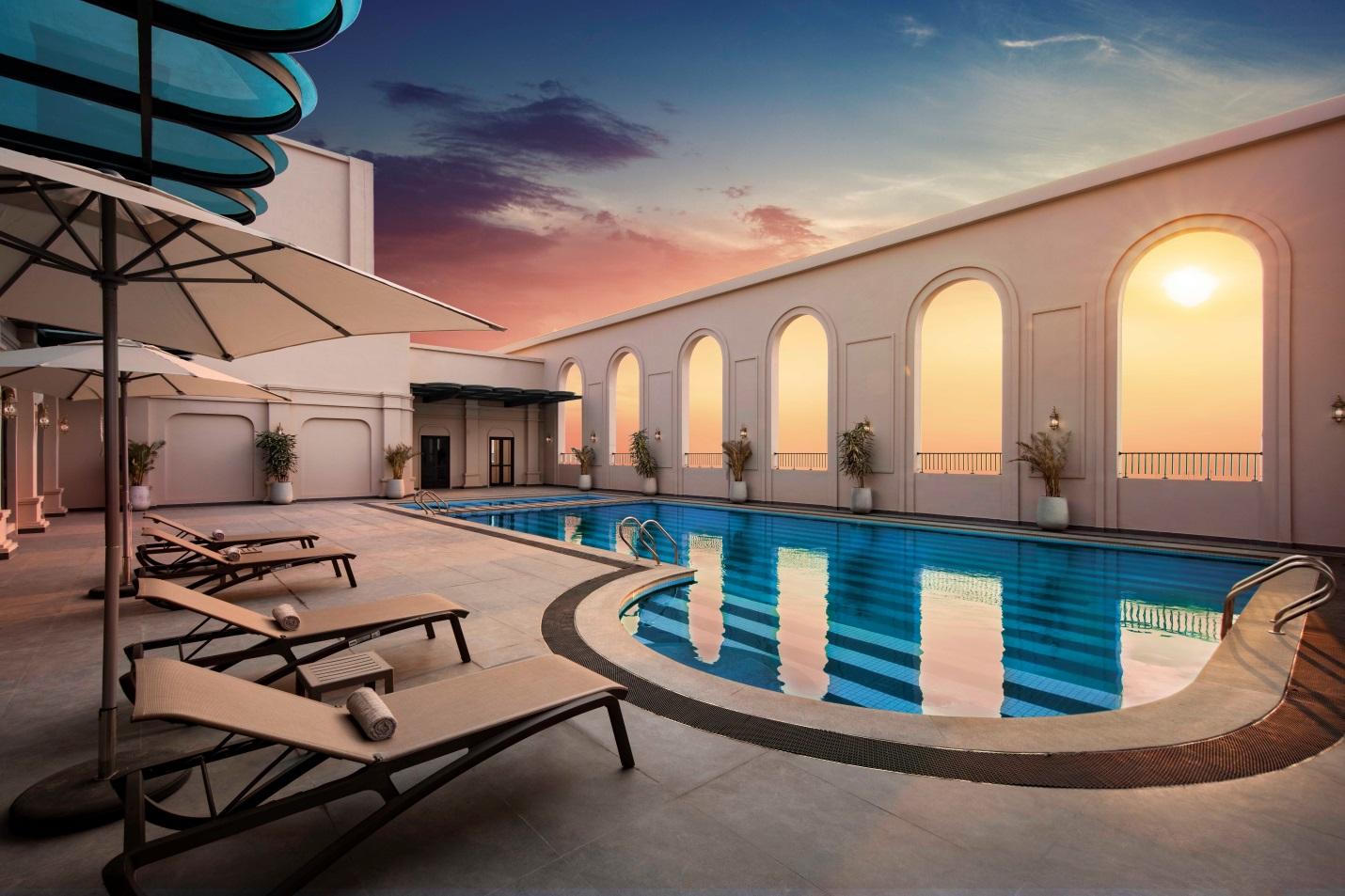 Khu vực bể bơi ngoài trời tại King Palace (108 Nguyễn Trãi, Thanh Xuân, Hà Nội) cũng sở hữu tầm view hoàn mỹ. |