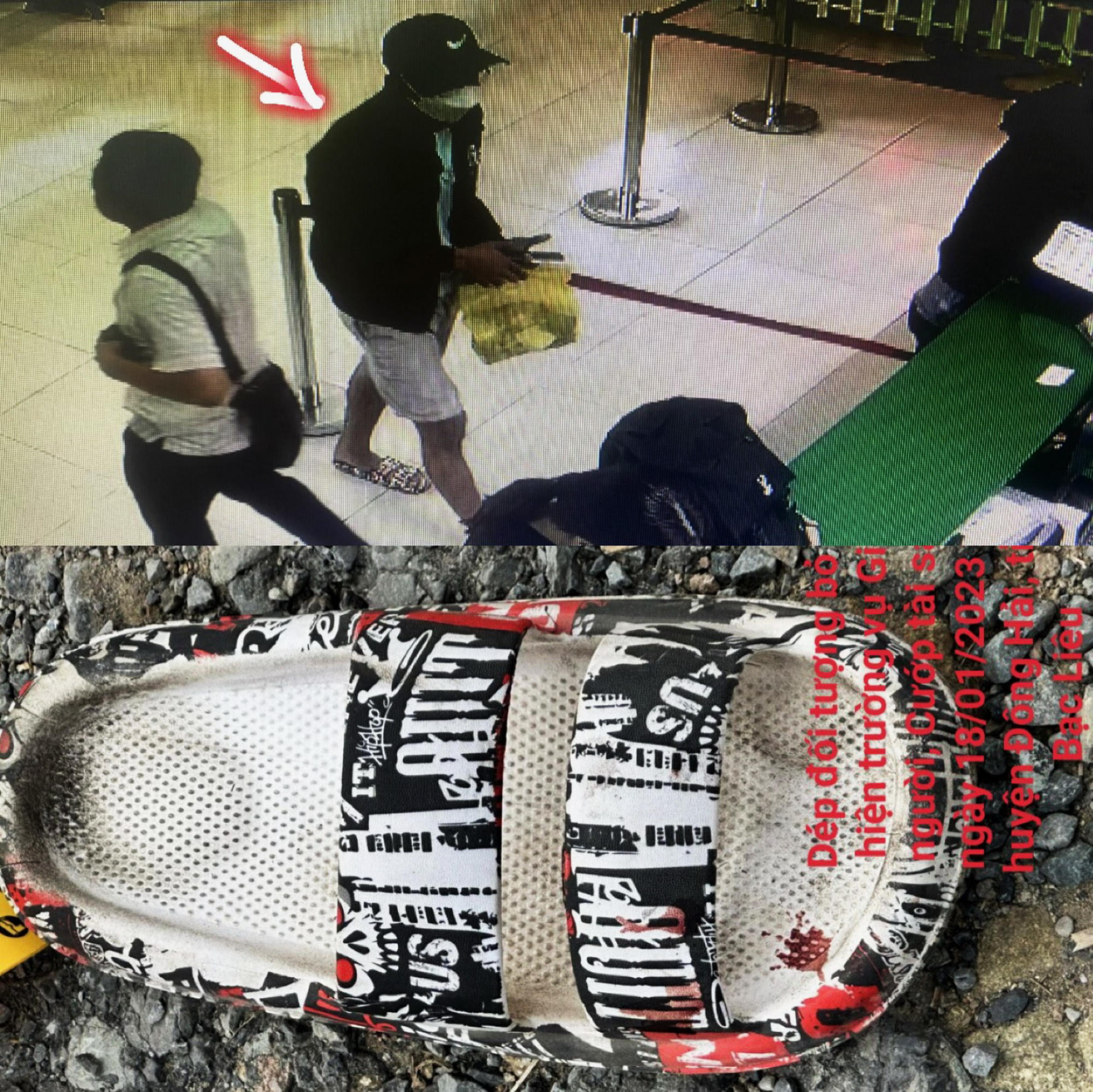 Hình ảnh đối tượng gây án và chiếc dép đối tượng bỏ lại hiện trường (Clip và ảnh: Công an tỉnh Bạc Liêu cung cấp). |
