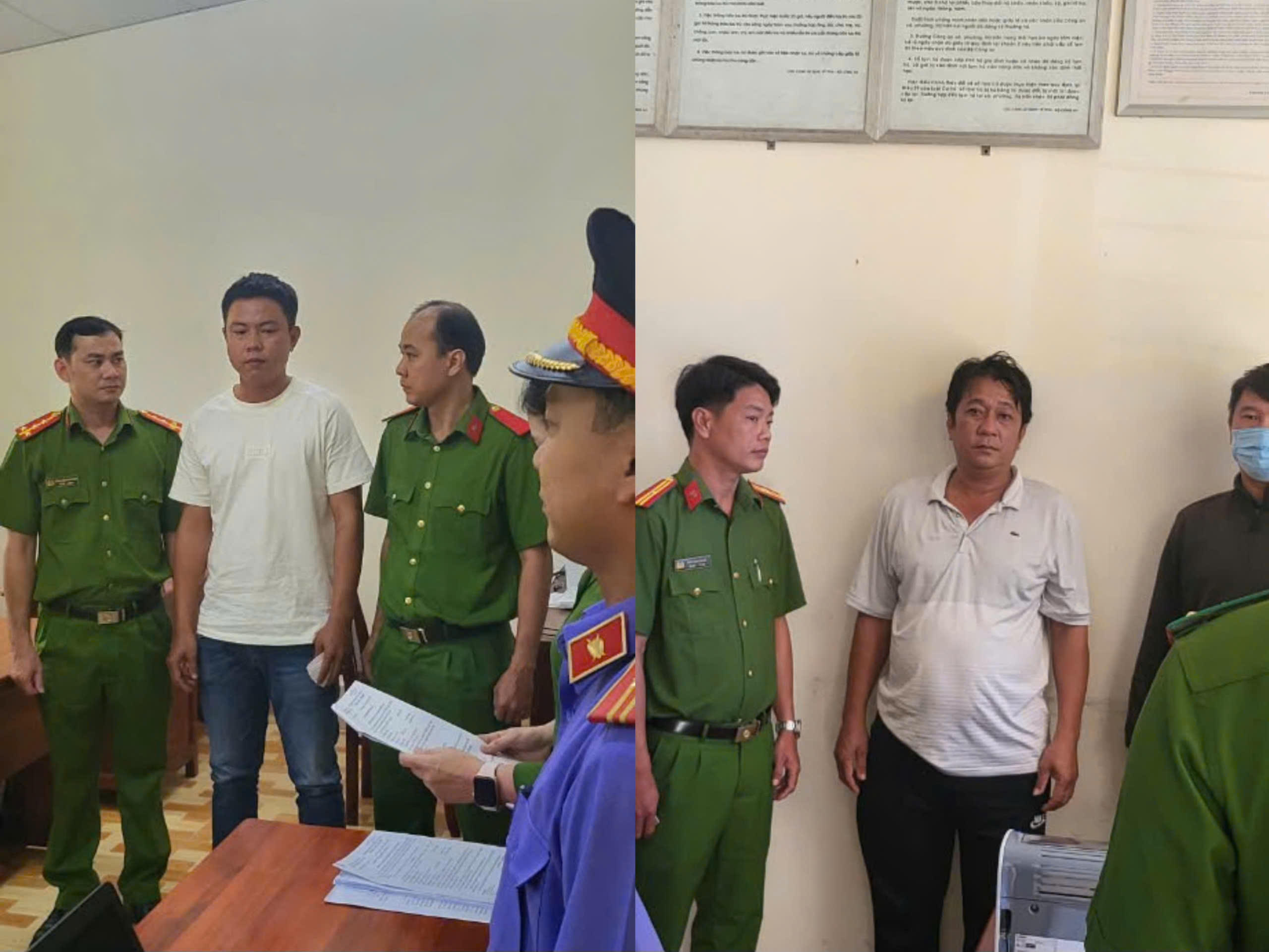 Thi hành lệnh bắt bị can Nguyễn Văn Tiền (áo thun bên trái) và Đặng Minh Dương (áo thun bên phải) để điều tra về hành vi lừa đảo chiếm đoạt tài sản. (Ảnh: Công an Kiên Giang) |