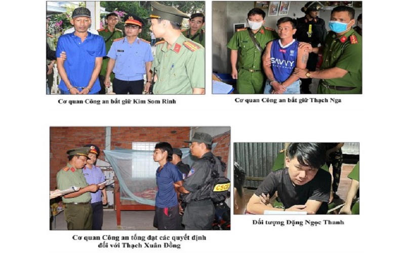 Các đối tượng bị Công an tỉnh Trà Vinh khởi tố, bắt tạm giam gồm: Đặng Ngọc Thanh (SN 1993, trú tại Ấp 8, xã An Trường, huyện Càng Long), Thạch Nga (SN 1990, trú tại ấp Đồng Khoen, xã Phong Phú, huyện Cầu Kè), Kim Som Rinh (SN 1979, trú tại ấp Đại Trường, xã Phú Cần, huyện Tiểu Cần), Thạch Xuân Đồng (SN 1987, trú tại ấp Nhì, xã Tân Hùng, huyện Tiểu Cần)