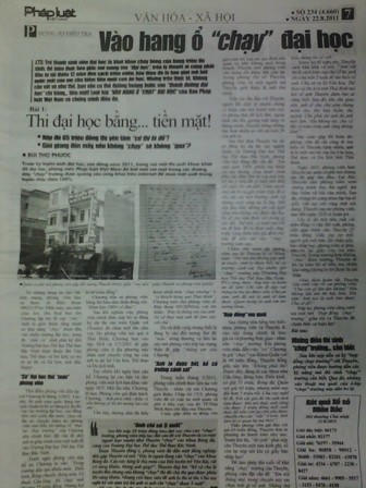 Trước đó, trong các số báo ra tuần trước, báo PLVN đã đăng tải loạt bài phóng sự điều tra: Vào hang ổ "chạy" đại hoc. Loạt bài trên phản ánh về hoạt động của một đường dây chạy vào trường ĐH TDTT Bắc Ninh với giá phổ biến từ 60 đến 65 triệu cho một suất vào đại học.