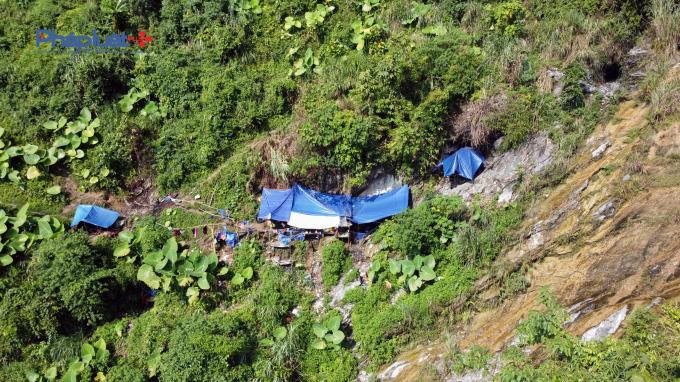 Các đối tượng lợp lán khai thác vàng trái phép giữa lưng chừng núi Pá Phay.