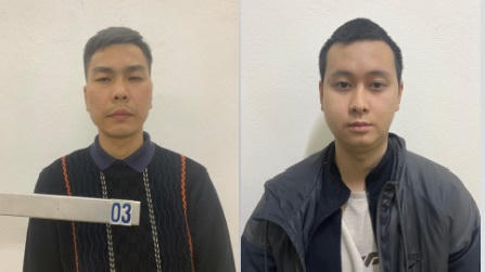 Hai đối tượng Nguyễn Anh Tú (trái) và Nguyễn Chí Công (phải) tại cơ quan công an. |