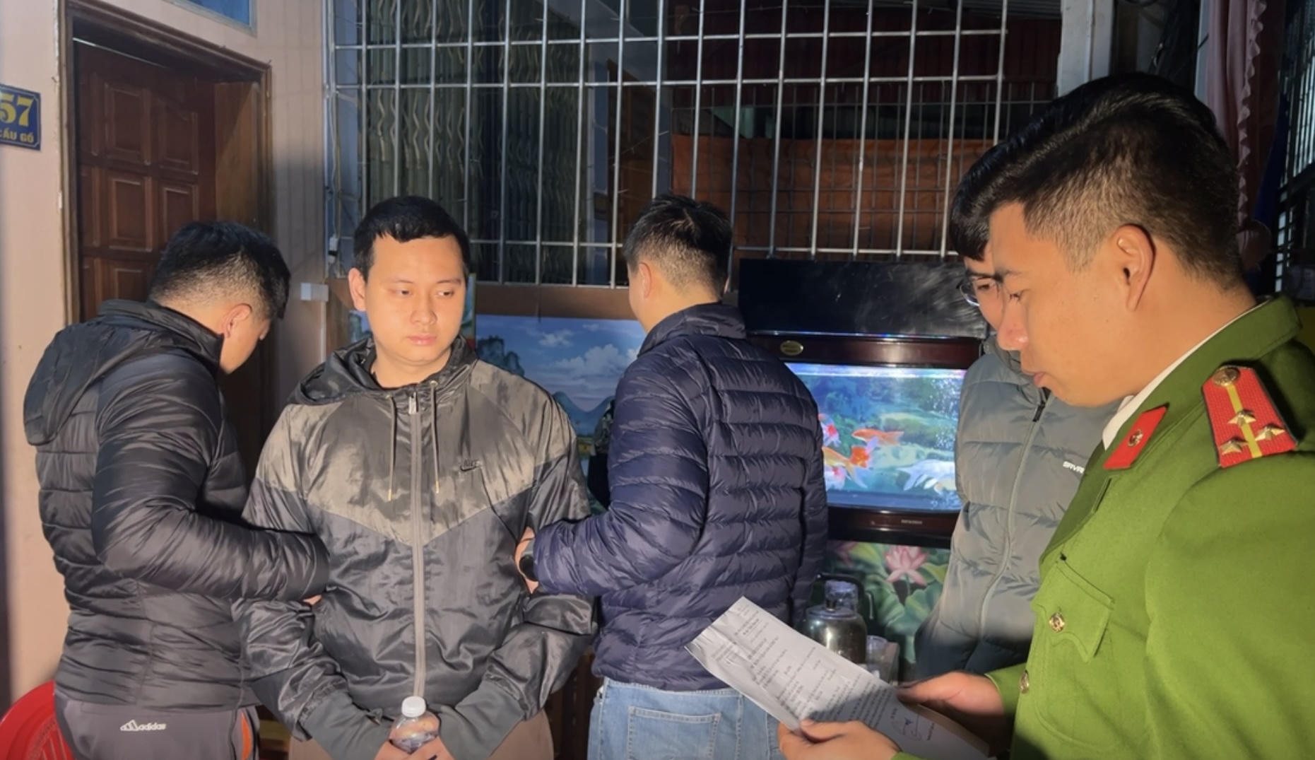 Lực lượng chức năng thi hành lệnh khám xét tại nhà đối tượng Nguyễn Chí Công. |