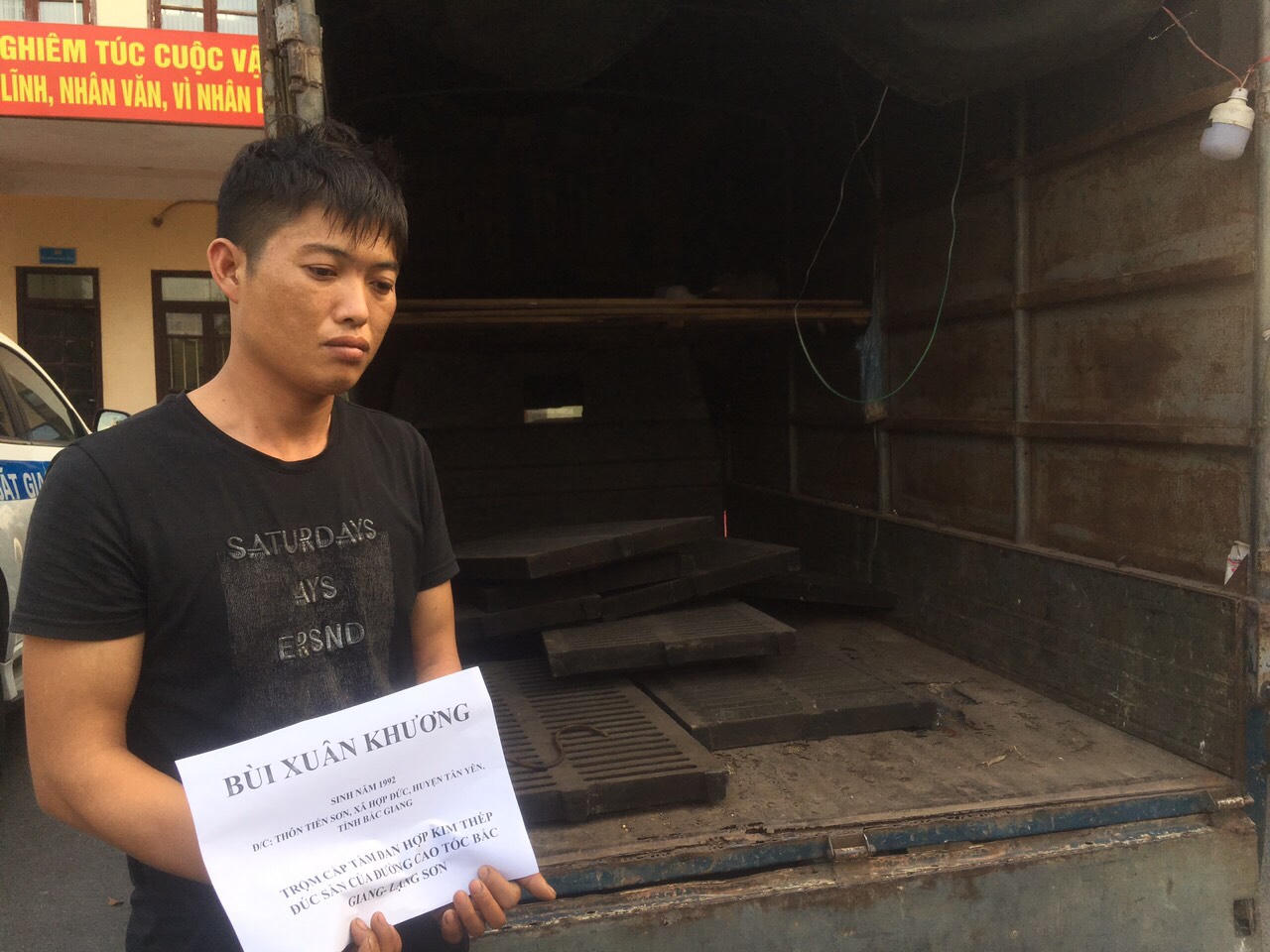 Nhận được tin báo của người dân huyện Lạng Giang, tỉnh Bắc Giang về việc phát hiện xe ô tô tải BKS: 30H-6014 có nhiều biểu hiện nghi vấn trộm cắp tài sản. Công an huyện Hữu Lũng đã triển khai các biện pháp nghiệp vụ, xác định đối tượng là Bùi Xuân Khương (SN 1992, trú tại xã Hợp Đức, huyện Tiên Yên, tỉnh Bắc Giang) là thủ phạm vụ trộm 09 nắp cống thoát nước thuộc Km 84 – 90 trên tuyến cao tốc Bắc Giang – Lạng Sơn.