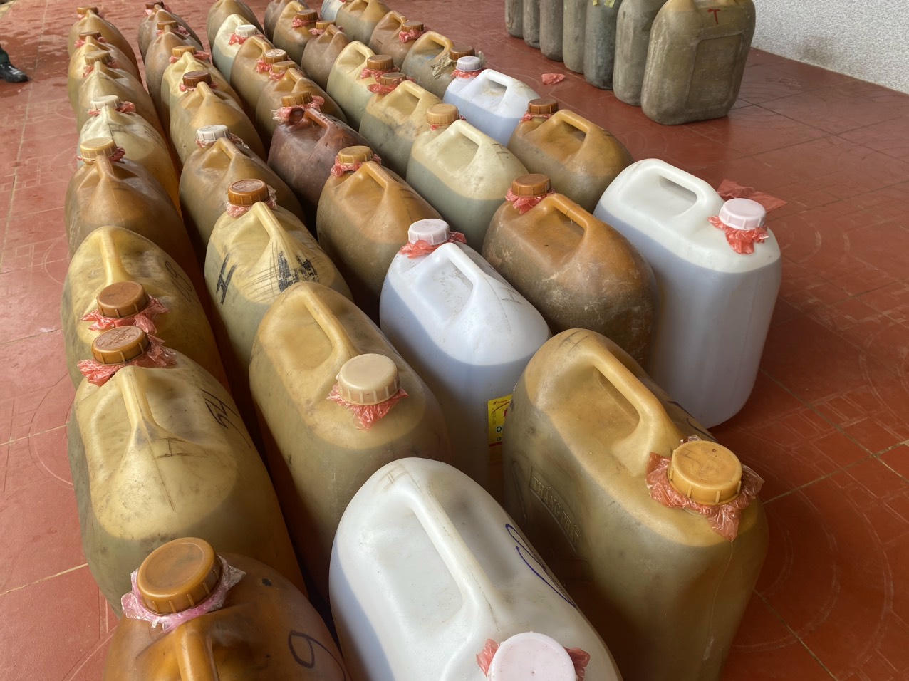 Từ lời khai của bà H, lực lượng ptuần tra Bộ đội biên phòng phối hợp với Công an địa phương tiến hành kiểm tra nhà ở bà Nguyễn Thị Hường (trú xã Bình Châu, huyện Bình Sơn). Tại đây, lực lượng chức năng phát hiện bà Hường tồn trữ 85 can nhựa, loại 30 lít và 7 thùng phi, loại 200 lít chứa chất lỏng cất giấu trong khuôn viên nhà ở.