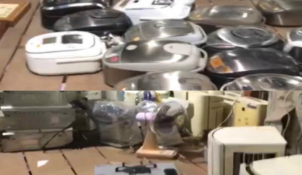 Tại đây lực lượng chức năng phát hiện trong kho đang chứa 714 sản phẩm thuộc nhiều nhóm mặt hàng như: bếp từ, bếp ga, cục nóng, cục lạnh máy điều hòa nhiệt độ, quạt gió, máy giặt, nồi cơm điện, đồng hồ treo tường….ước tính trị giá khoảng 250 triệu đồng.
