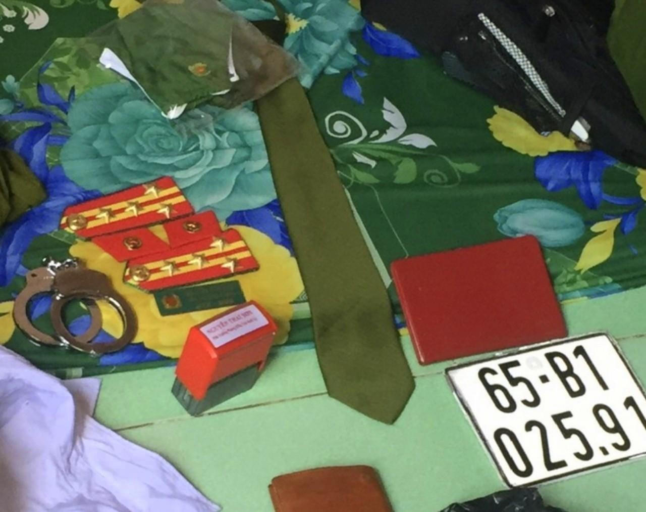 Cầu vai, biển tên công an nhân dân, dấu tên mực đỏ, khóa số 8 và và biển số xe mô tô đang sử dụng bị thu giữ được tại nơi ở của Sơn. |