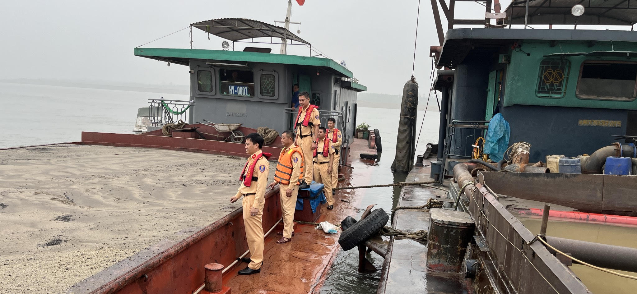 Theo đó, trong trình kiểm tra con tàu có số đăng kiểm VR07032015, lực lượng chức năng phát hiện tàu trên đang sử dụng hệ thống hút cát vào 2 khoang của tàu. Đồng thời, hút cát sang tàu mang số hiệu HY-0607.