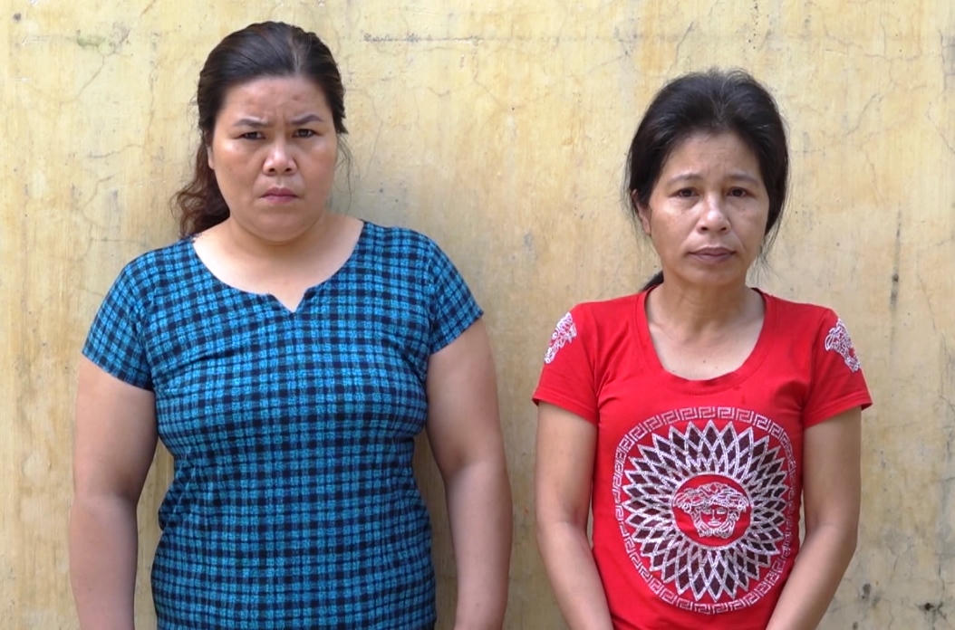 Hai đối tượng Nguyễn Thị Hồng Mai (áo đỏ) và Mai Thị Hà Diễm Chi (áo xanh). |