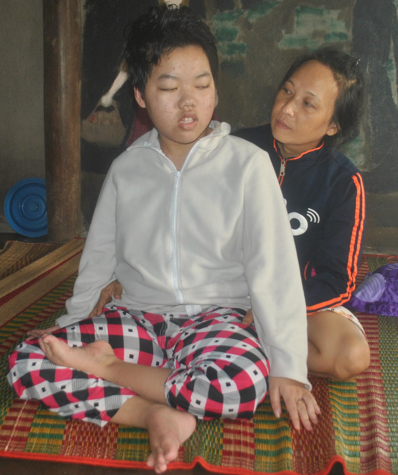 Thật sự khi nhìn thân hình của hai mẹ con chị Xuân, chúng tôi không khỏi đau lòng, bởi thể trạng rất yếu ớt, đặc biệt là Hiền. Em chỉ nằm co cụm, yếu ớt trên chiếc chiếu giữa nhà, khi nào mỏi thì nhờ mẹ dùng chút sức lực ít ỏi đỡ dậy ngồi một lát rồi lại nằm tiếp. Lúc chúng tôi đưa tay nắm lấy tay Hiền, em như nhận ra được điều gì đó nên dòng nước mắt cứ rưng rưng.