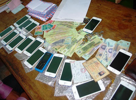 Tiến hành khám xét, lực lượng chức năng thu giữ 14 điện thoại hiệu Iphone không có nguồn góc xuất xứ, 8 triệu đồng tiền mặt, một xe máy mang BKS 37D1 – 04331 và một số lượng lớn thẻ cào điện thoại có mệnh giá từ 20 ngàn đồng đến 500 ngàn và nhiều tang vật liên quan đến vụ án.