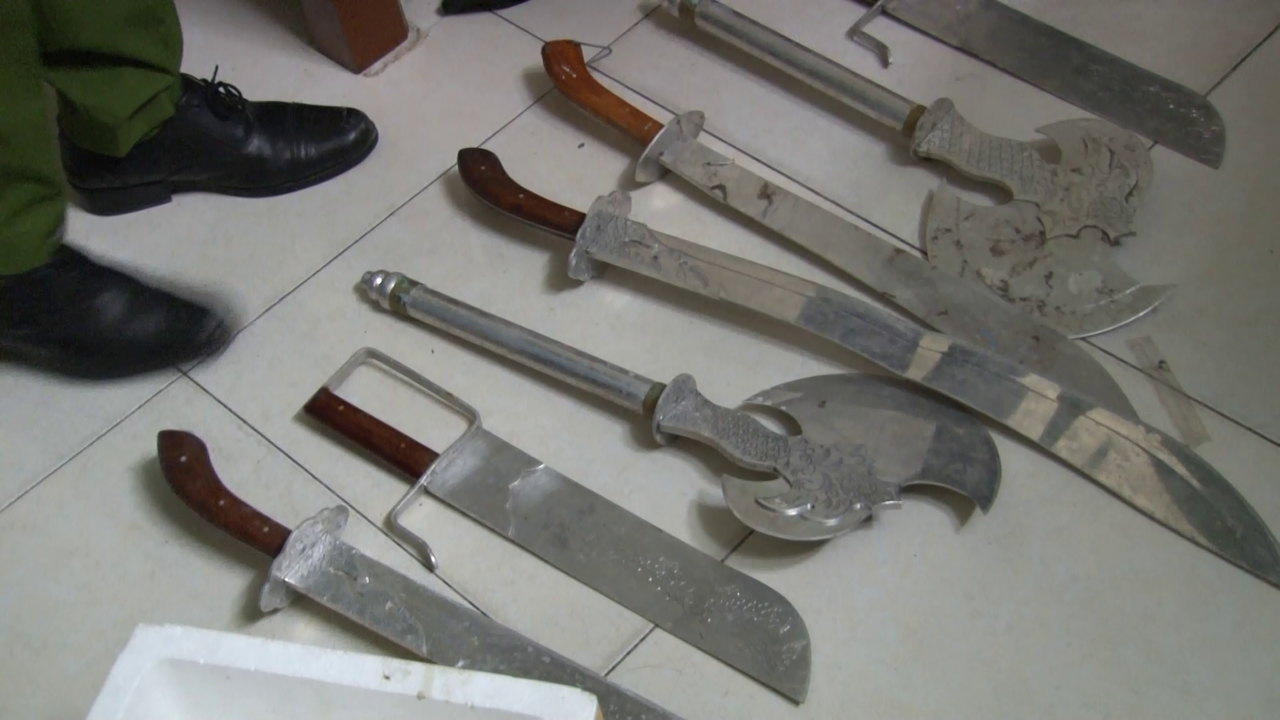 Khám xét nơi ở và xe ô tô của Thạch, lực lượng chức năng đã thu giữ 13 cây đao, 17 con dao, 3 roi điện, 5 viên đạn, 1 tuýp sắt, 1 nhị khúc, 1 tam khúc, 1 bình xịt hơi cay, 1 cây giáo, 1 khẩu súng có gắn bình hơi nén.