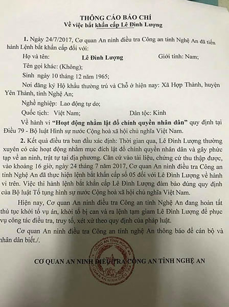 Công an Nghệ An khẳng định, việc thi hành lệnh bắt khẩn cấp Lê Đình Lượng đảm bảo đúng quy định của Bộ luật Tố tụng hình sự nước Cộng hòa xã hội chủ nghĩa Việt Nam.