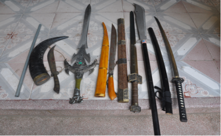 Qua quá trình điều tra, khám xét tại cửa hiệu cầm đồ Trần Quang cơ quan công an thu giữ được số lượng lớn dao và kiếm được cất giấu trong cửa hiệu.