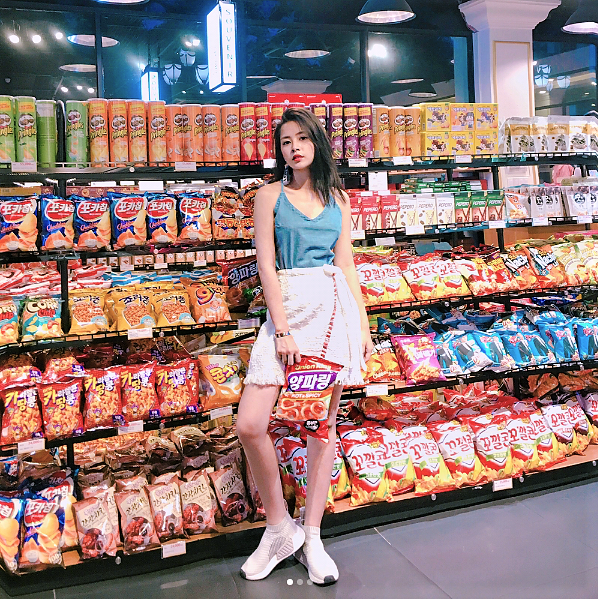 Chipu quyến rũ với áo hai dây denim cổ khoét sâu gợi cảm, kết hợp với chân váy tua rua được làm từ vải bố, một chất liệu thời trang rất độc đáo. Set đồ cho thấy khả năng mix & match trang phục mới lạ nhưng không làm mất đi phong cách thanh lịch thường thấy của cô nàng.
