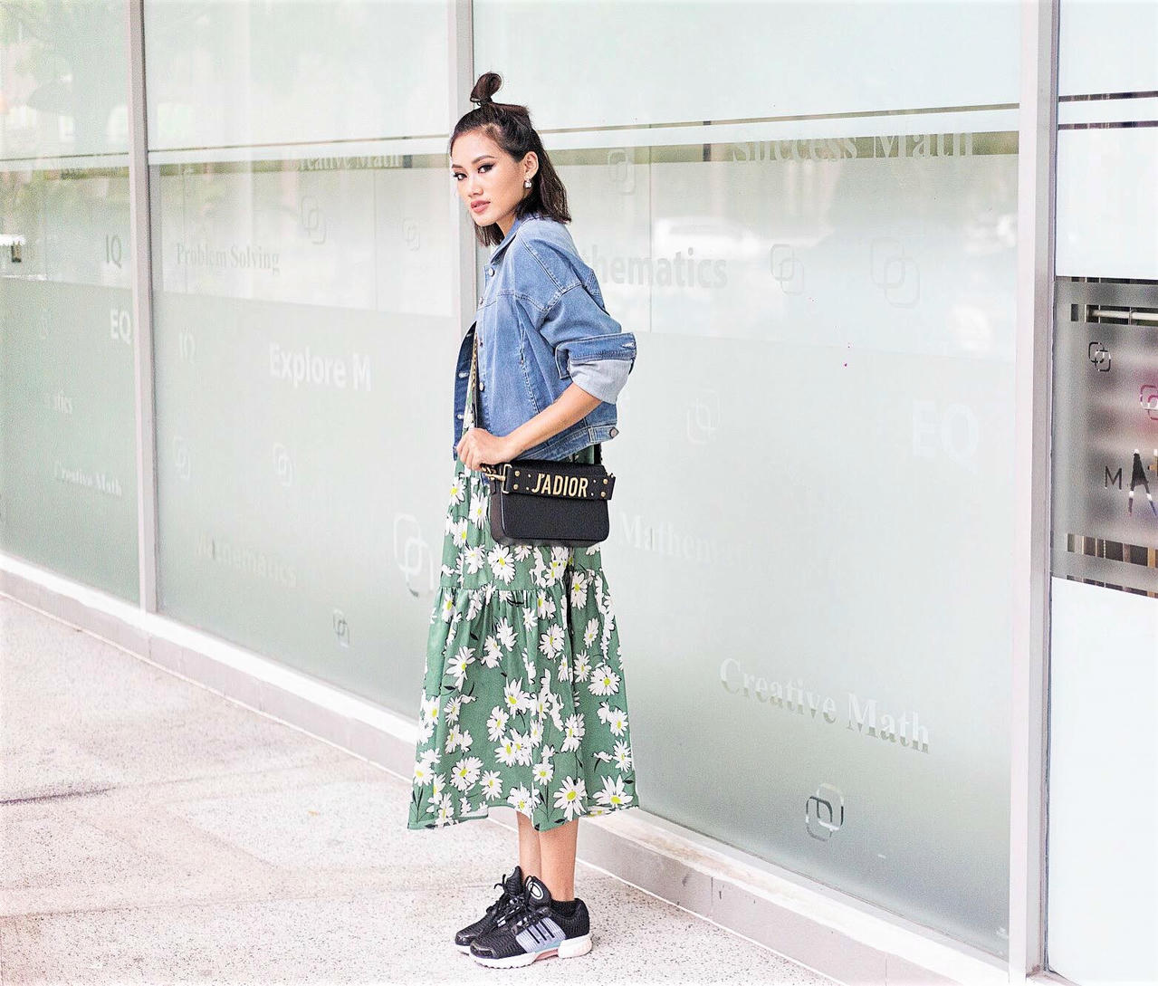Luôn gây ấn tượng với khả năng mix đồ biến hóa từng ngày, Đỗ Thanh Hoa chọn cho mình chiếc đầm xanh mint suôn dài điểm những đóa hoa cúc dại trắng đáng yêu, không quên sự kết hợp cùng áo khoác đến từ thương hiệu denim đình đám Lee, túi J’adior xu hướng của nửa đầu năm 2017 và sneaker adidas cá tính.