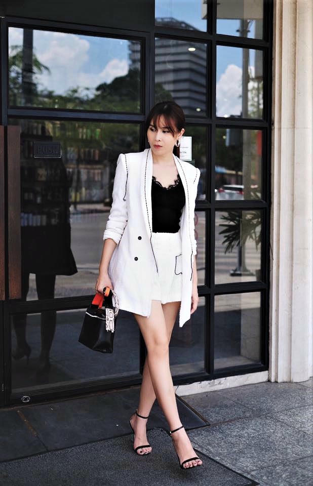 Lưu Hương Giang càng ngày càng cho thấy gu thời trang sang trọng, quý phái của mình với những set đồ trơn hoặc hai màu nhất định. Bộ trang phục dạo phố tuần này là hai gam màu trung tính đen-trắng với chiếc áo dây ren đen gợi cảm được khoác bên ngoài bởi áo vest nữ thanh lịch trắng diềm hạt ở cổ.